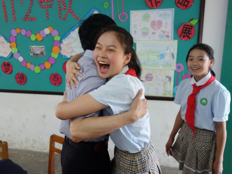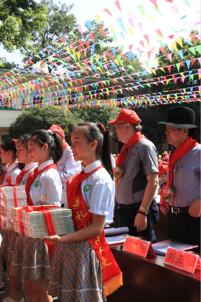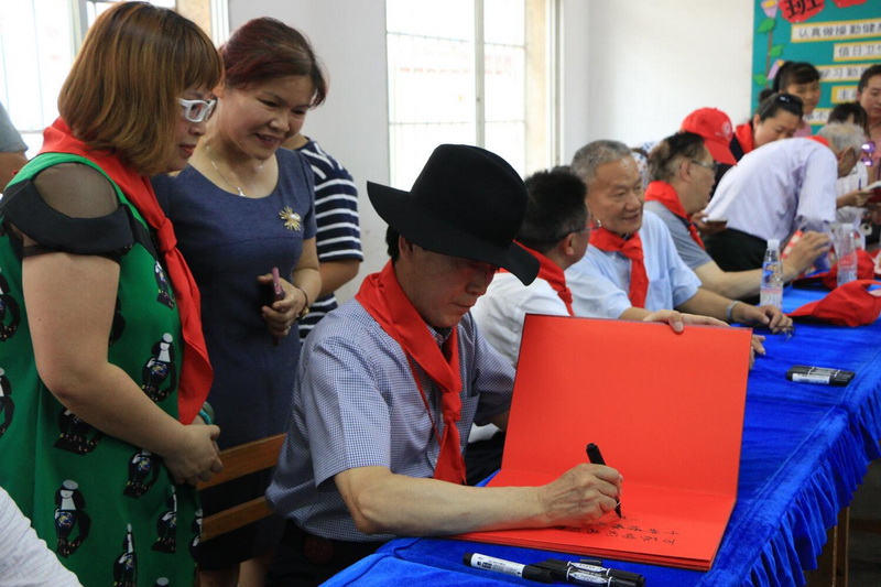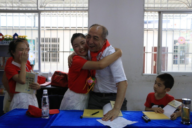 欢快的《大风车》歌曲和操场上挥动着的七彩小风车迎来了期盼已久的作家们,孩子们高呼着作家的名字,不敢相信这些把外面的辽阔世界带到眼前的作家们居然走入了小小的农村学校。