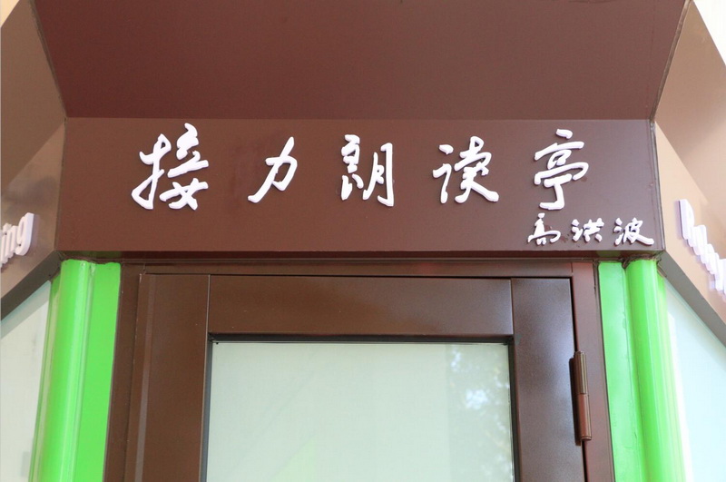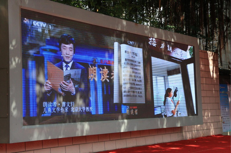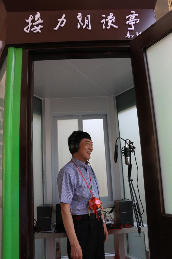 当央视《朗读者》中曹文轩朗读《草房子》片段的视频在大屏幕中播放时,在座的嘉宾惊喜万分。更让人吃惊的是,在视频中,居然有一个竹鹅娃在与曹文轩进行隔空对话。这样的对话,穿越了南北,从首都北京,到祖国的西南,从央视的演播大厅,到小小的农村学校。原来,这是我校为“香樟学园”建设打造的一座接力朗读亭,旨在让每个孩子都能通过周二下午的阅读课,来到朗读亭,听听自己朗读的声音。曹文轩与孩子在深情诵读完《草房子》片段后,感慨地说:“这段视频还是我录制完节目后第一次看到。”童心未泯的作家们对朗读亭充满了好奇,活动结束,纷纷来到朗读亭一试身手,亮亮嗓,高洪波和白冰在朗读亭前会心一握。(曹文轩与竹鹅娃诵读图,高与白握手图,朗读亭朗读图,接力朗读亭图)